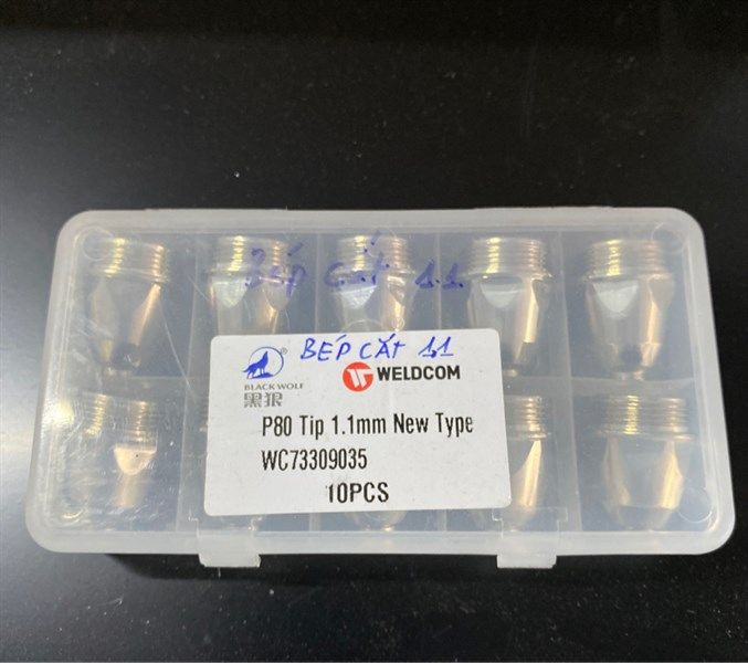 Bộ sản phẩm Bép cắt Plasma được nhập khẩu trực tiếp bới WELDCOM, đơn vị rất quen thuộc với người dùng qua thương hiệu máy hàn, cắt Jasic. Bộ sản phẩm gồm 10 đầu bép cắt lỗ 1.1mm được đóng gói trong hộp nhựa, sử dụng cho súng cắt Plasma P80.