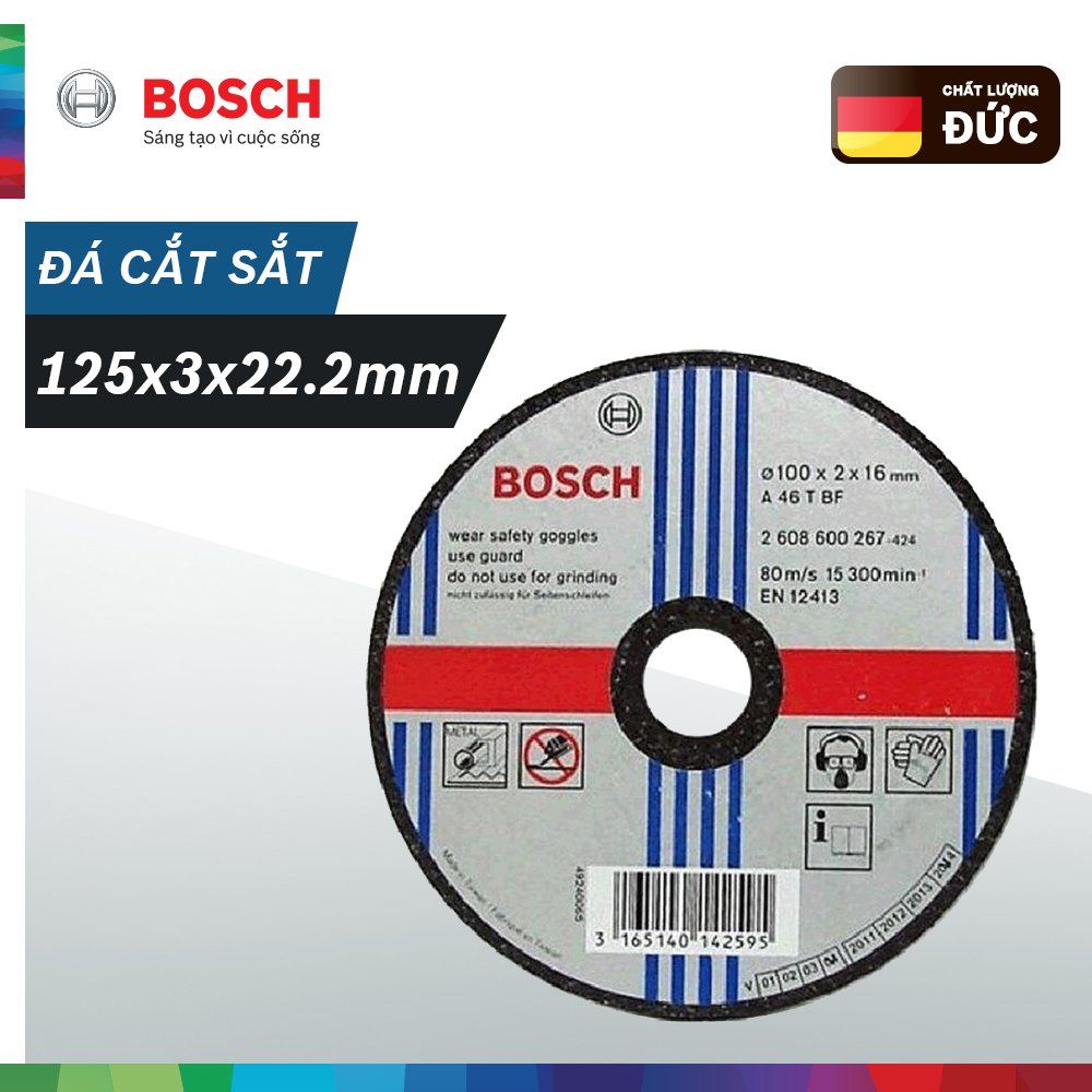 Đá cắt Bosch 125x3x22.2mm (sắt) được sản xuất theo tiêu chuẩn chất lượng quốc tế EN 12413, có độ bền cao, rất tiện dụng với độ an toàn tuyệt đối.