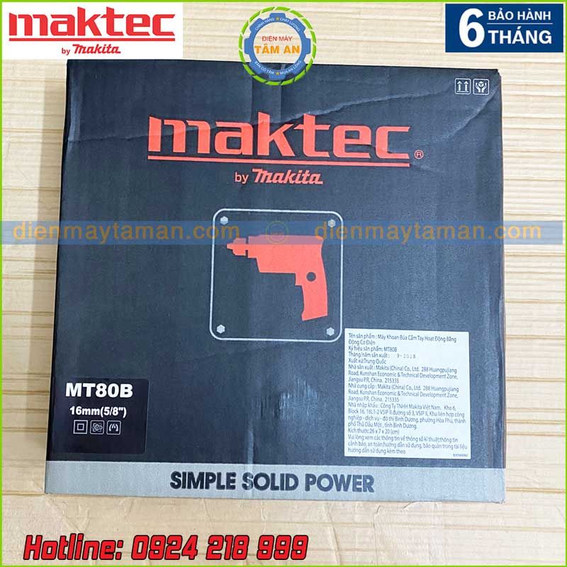 Có thông tin đầy đủ về nguồn gốc xuất xứ, tên sản phẩm trên bao bì máy khoan đa năng Maktec MT80B: